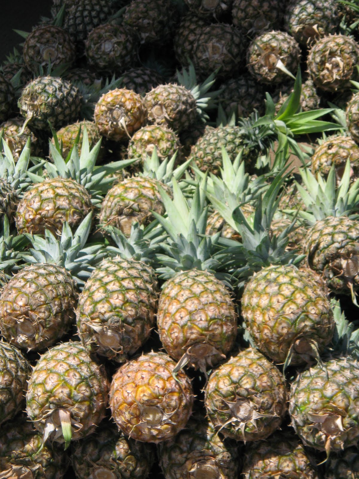 Pineapples, though a summer fruit, have been made to be able to blossom anytime during the year, so we eat them even during the rainy season. The sweet variety, though - the small, compact ones - bear fruit in droves during the summer. These are very sweet and not abrasive to the tongue even though the skin is still green.